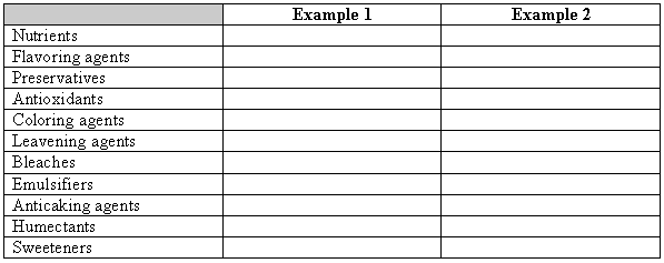 Directions: While looking at the ingredients section of food labels, find two examples for each of the 11 categories of food additives shown below. You may use the same label for more than one category. If the label lists the specific name of the additive, write the name underneath the product name.