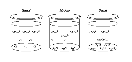 - As students titrate, ask them to notice the red Ag2CrO4 forming and then disappearing with swirling. Get them to explain the process. [The Ag2CrO4 forms and then dissolves as the AgCl precipitates preferentially because of its lower solubility.]