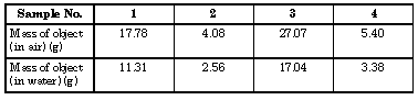 According toArchimedesÕprinciple,a bodyimmersedina fluidlosesanamount of weight equal to the weight of the fluid displaced. Water has a density of 1.00 g/cm 3 . Thus,everygramof reductionintheweight duetothisArchimedesÕ buoyancyeffectrepresents avolumeof1.00cm 3 for the immersed object.Below is an extended data chart revealing the densities of the four test objects.