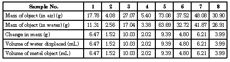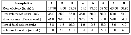 The activity can make use of the volume displacement technique. Students can weigh the dried metallic objects on the balance pan. (Caution students not to drop the metallic object into a glass graduated cylinder since the graduated cylinder might break.) If time is short, have students measure six objects instead of eight. If you choose the weight displacement method, demonstrate how to tare the thread.