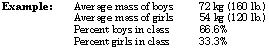 Given the average mass (weight) of boys and girls in a class and the percent boys by mass and percent girls by mass, calculate the ratio of boys to girls and the "formula" for the class (BxGy).