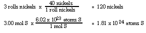 The Roll-Mole Worksheet (which follows) is designed to be used by answering Problems 1, 2, 1', and 2' first. Then have students fill in the blanks on the equalities. After this point, students are told to "forget" that a nickel is worth 5 cents and a quarter is worth 25 cents. They must not use that information in solving Problems 3 through 6 or the purpose of the exercise is defeated. (Nobody remembers the mass of an atom of an element or a formula unit of a compound!) The worksheet points out the information students are allowed to use to solve the problems. To use the worksheet most effectively, work Problem 3 and 3' side-by-side on the board so students see that the reasoning is identical. Students should be made aware of the reasoning (use a set up) for each